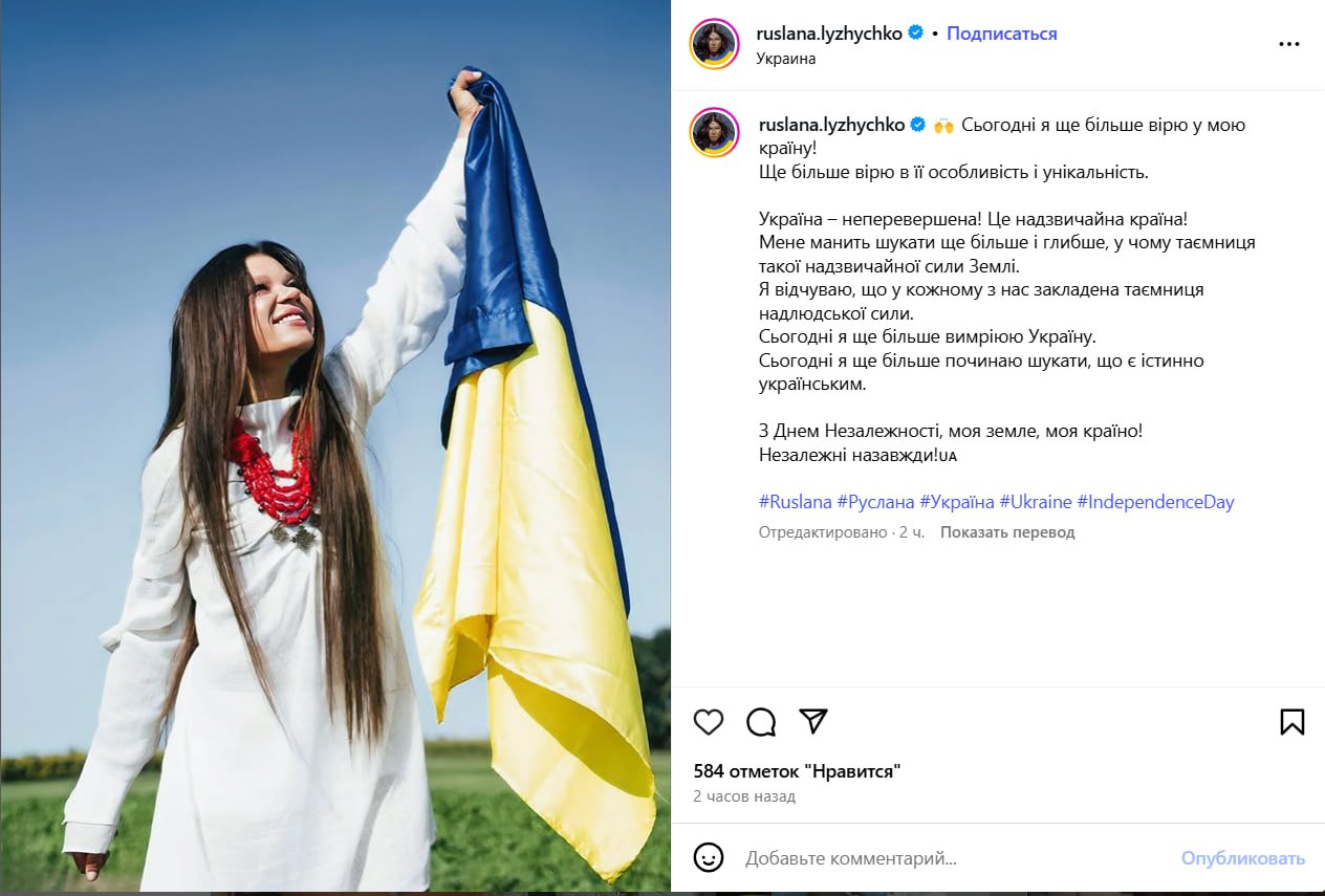 Руслана поздравила с Днем Независимости. Скрин: instagram.com/ruslana.lyzhychko