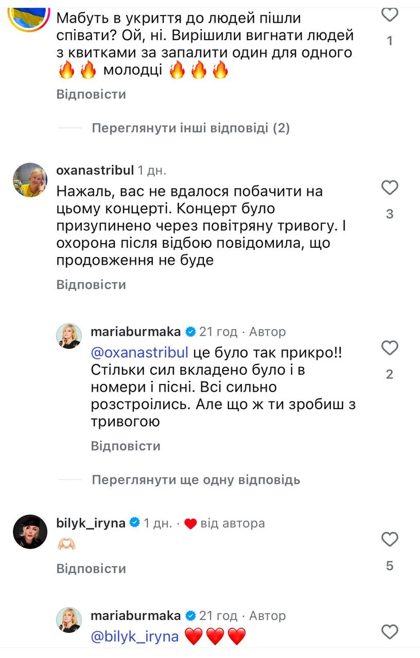 Снимком поделилась Мария Бурмака, добавив, что, несмотря на тревоги и обстрелы, они все равно поют. Впрочем, не все пользователи в Сети восприняли сообщение положительно. Часть зрителей, не дождавшихся продолжения концерта после отбоя тревоги, выразили недовольство. Они отметили, что билеты оказались потеряны, ведь выступления так и не возобновили.