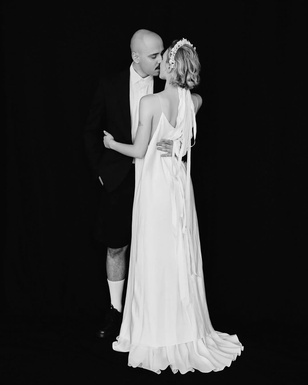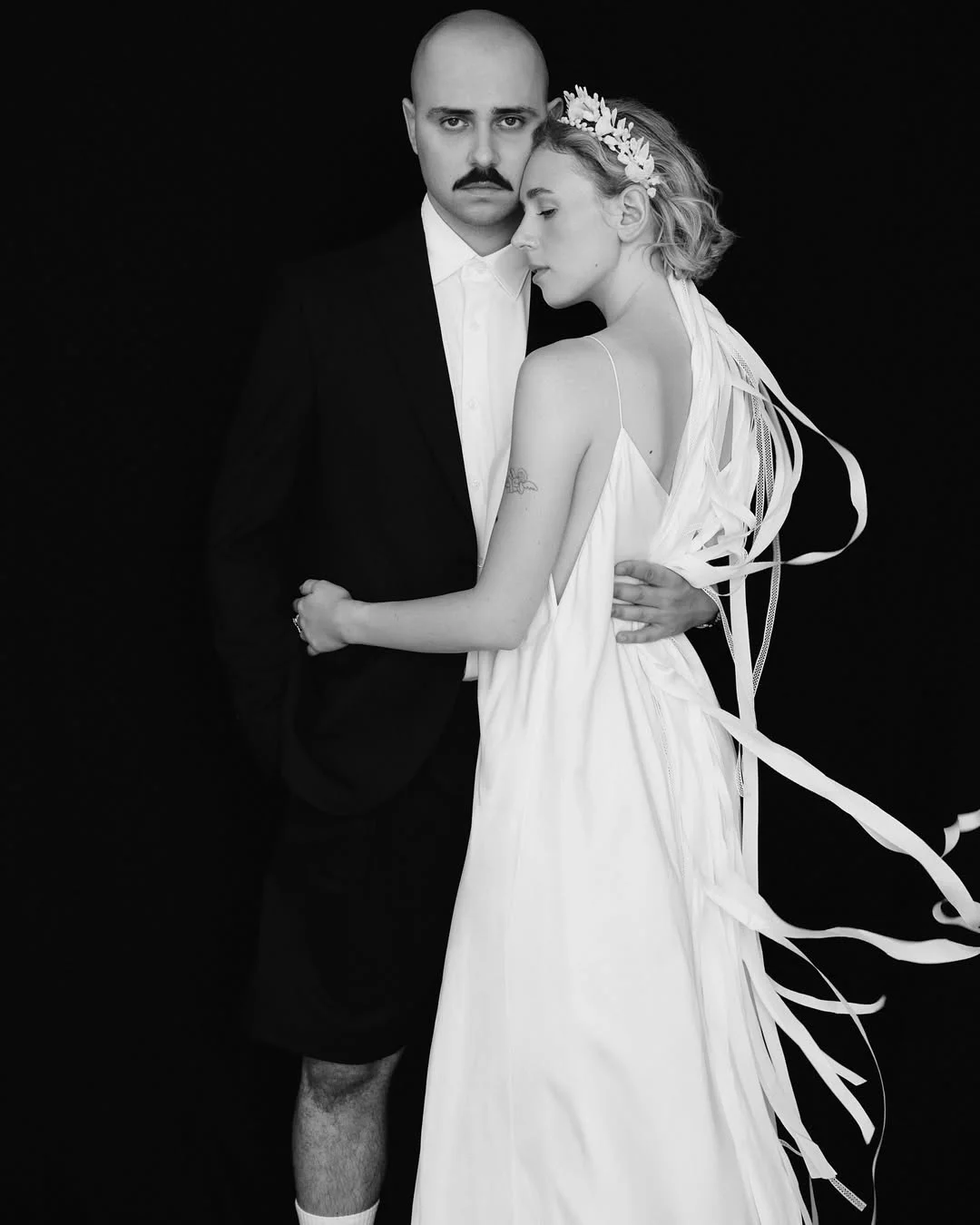 В соцсетях артист и бизнесвумен поделились стильными черно-белыми кадрами, объявившими о своей свадьбе. Звездная пара выбрала для особого дня минималистичные и вместе с тем элегантные образы. Невеста предстала в длинном белом платье на тонких бретелях с венком и лентами в волосах, а исполнитель заменил классические брюки на удлиненные шорты, оставив пиджак и рубашку.