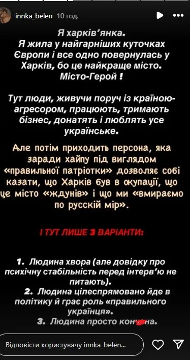 Блогерша и волонтер Елена Мандзюк, которая обвинила Инну Белень в ливне информации, позволила себе резкие слова о харьковчанах, заявив, что среди них есть "ждуны". Ее высказывания мгновенно стали поводом для хейта в Сети: пользователи возмущались, что подобные слова звучат от человека, не являющегося жителем города.