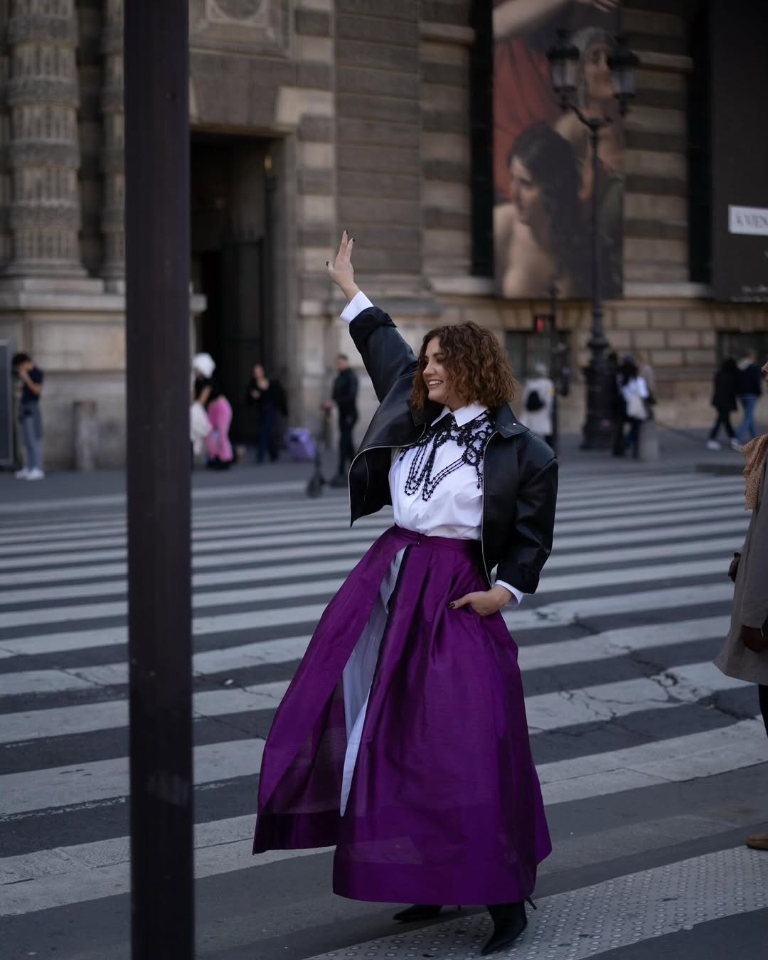 Для фотосессии артистка выбрала эффектное сочетание – длинную белоснежную рубашку, кожаную куртку и пышную фиолетовую юбку с разрезом. Образ она дополнила черными ботфортами на шпильках и массивным ожерельем, подчеркнувшим ее фигуру.