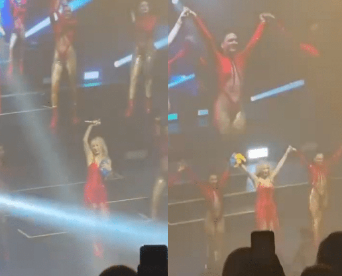Этим моментом поделилась пользовательница vi_valeri_k в Threads, где видно, как артистка держит флаг, а затем передает его танцовщице, чтобы та отнесла его за кулисы. Этот жест возмутил Сеть.