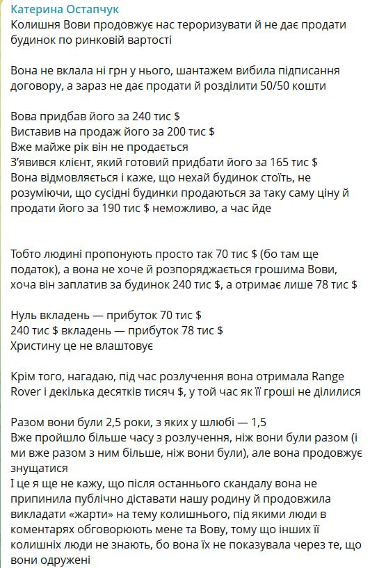 По словам Полтавской, Владимир Остапчук приобрел дом за 240 тысяч долларов, а затем выставил его на продажу за 200 тысяч. Однако покупателей не появилось. Когда нашелся клиент, готовый приобрести недвижимость за 165 тысяч долларов, Кристина Горняк, по словам Екатерины, отказалась согласиться на сделку.