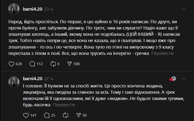 В своих сообщениях он заявил, что написал песню еще в 16 лет, отрицал обвинения в изнасиловании и переложил ответственность на саму Надин. В публикациях прозвучали оскорбительные формулировки, упоминания якобы "хаотических половых связей" и попытки оправдать школьный буллинг.