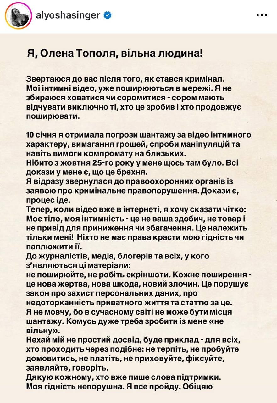 По словам Тополя, еще 10 января она начала получать угрозы и требования заплатить деньги за нераспространение видео интимного характера. Певица сразу обратилась в правоохранительные органы с заявлением об уголовном правонарушении и передала все доказательства.