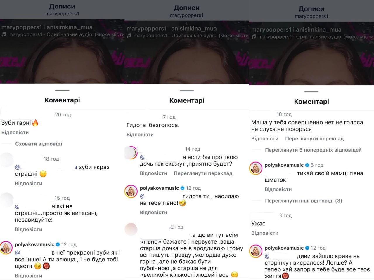 Впрочем, вместо поддержки часть аудитории избрала другой путь. В комментариях появились упреки в вокале и облике Маши, что мгновенно вызвало гнев звездной мамы. Оля Полякова вступила в жесткую словесную перепалку с хейтерами, не сдерживая эмоций и давая понять, что ни один аккаунт в соцсетях не имеет права унижать ее дочь.