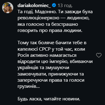 Украинские поклонники мгновенно отреагировали на сообщение и не скрывали своего возмущения. Особенно острую реакцию вызвала именно советская символика на головном уборе звезды, которая ранее неоднократно говорила о поддержке Украины и осуждала российскую агрессию.