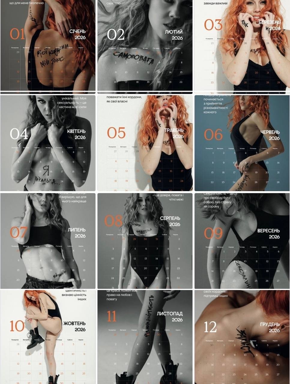 Я написала важные слова на своем теле, потому что это мой голос, моя сила и мой выбор. Каждый месяц – это напоминание: твое тело – твое, твоя сексуальность – твоя, твоя идентичность – твоя. Я хочу, чтобы этот календарь помог тысячам людей в Украине почувствовать себя сильнее, свободнее и увереннее в своих границах. Потому что, когда мы уважаем себя, мы меняем мир вокруг!
