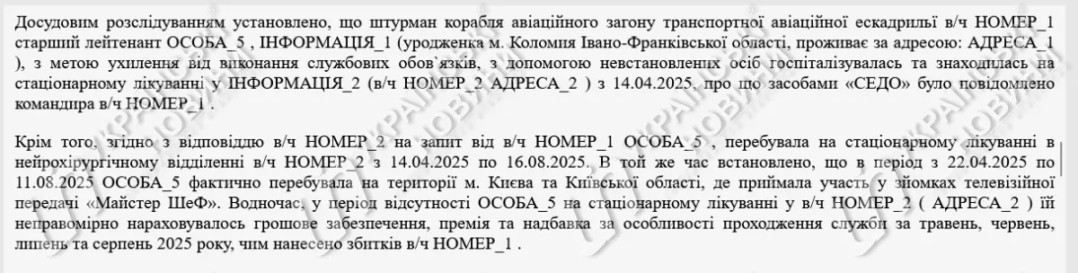 Согласно решению Печерского районного суда Киева, военнослужащая, являющаяся штурманом авиационного отряда, с 14 апреля по 16 августа 2025 года официально числилась как в больнице. В то же время следствие установило, что с 22 апреля по 11 августа она была в Киеве, где участвовала в съемках "МастерШеф".