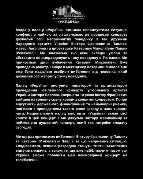 Юбилейное выступление Виктора Павлика 21 марта во Дворце "Украина" неожиданно обернулось громким конфликтом между организаторами мероприятия и женой певца — Екатериной Репяховой. По ее словам, они устроили за кулисами психологическое давление с использованием нецензурной лексики, запрещали зрителям дарить цветы и выпустили афишу концерта без фотографий самого артиста.