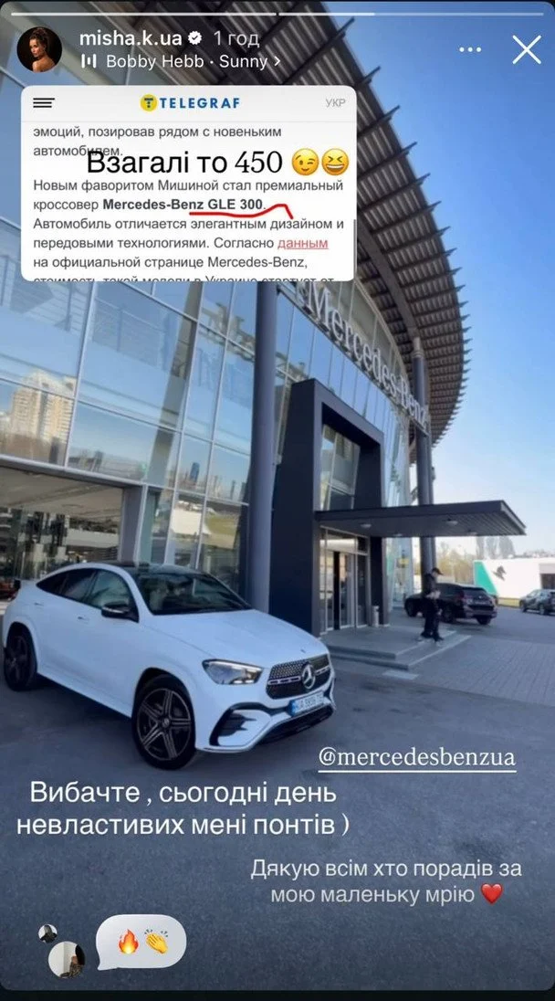Ксения Мишина купила Mercedes GLE 450 за 5 миллионов гривен. Скриншот: instagram.com/misha.k.ua