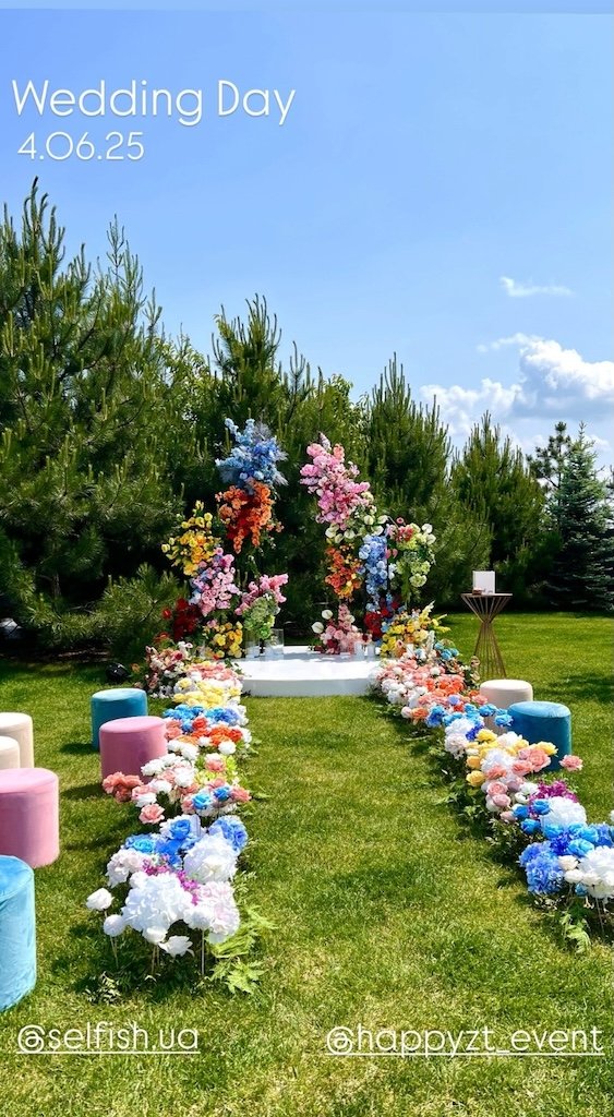 Влюбленные сказали «да» друг другу у арки, путь к которой был украшен разноцветными цветами. Гостей посадили за круглые столы, для которых подобрали скатерти разных цветов. Сами же молодые сидели в центре — за отдельным столиком, тоже украшенным букетами.