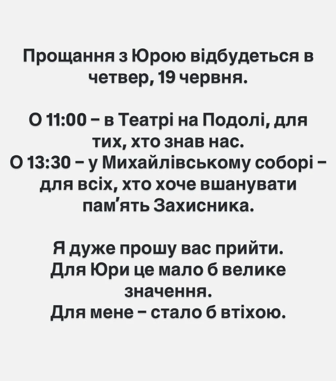 О деталях церемонии прощания сообщила супруга погибшего – телеведущая Екатерина Мотрич. По ее словам, попрощаться с Юрием можно будет в два этапа: в 11:00 в Театре на Подоле, а в 13:30 – в Михайловском Златоверхом соборе. Оба события открыты для всех, кто хочет почтить его память.