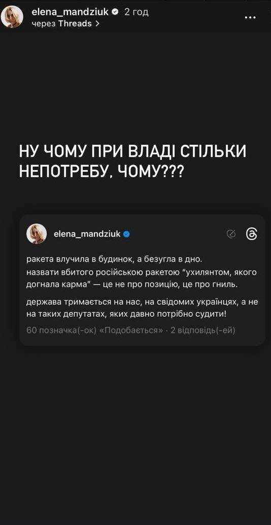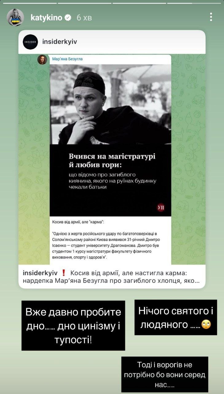 Ракета попала в дом, а Безуглая в дно. Назвать убитого российской ракетой "уклоняющимся, которого догнала карма" — это не о позиции, это о гнили. Государство держится на нас, на сознательных украинском, а не на таких депутатах, которых давно нужно судить!