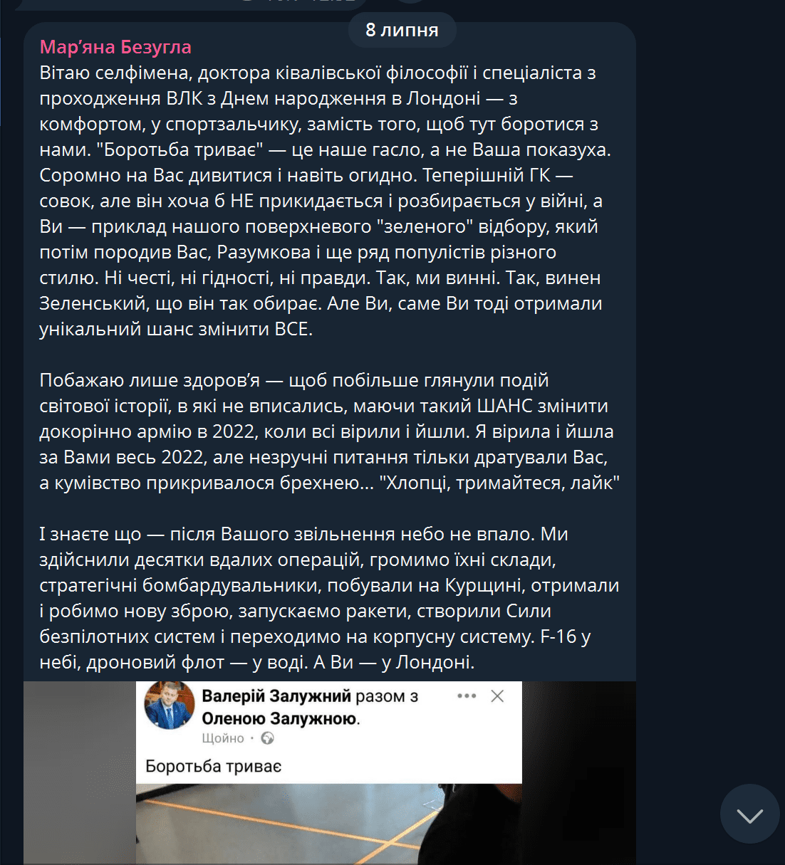 Безуглая “поздравила” Залужного с дн. Скрин