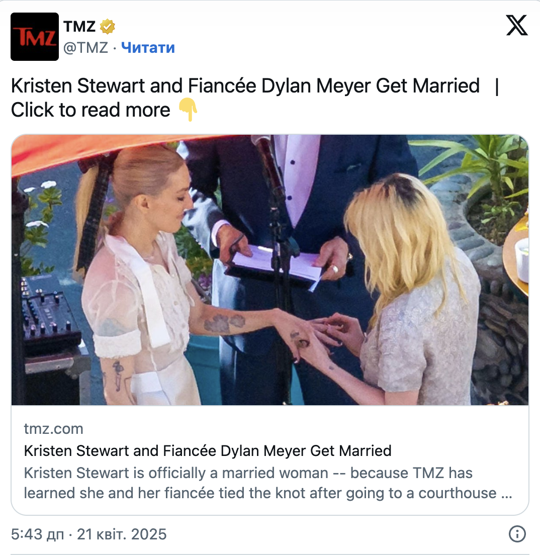 Звезда "Сумерки" Кристен Стюарт связала свою жизнь со сценаристкой и актрисой Дилан Майер. Свадьба прошла тайно на уютной локации в Лос-Анджелесе.