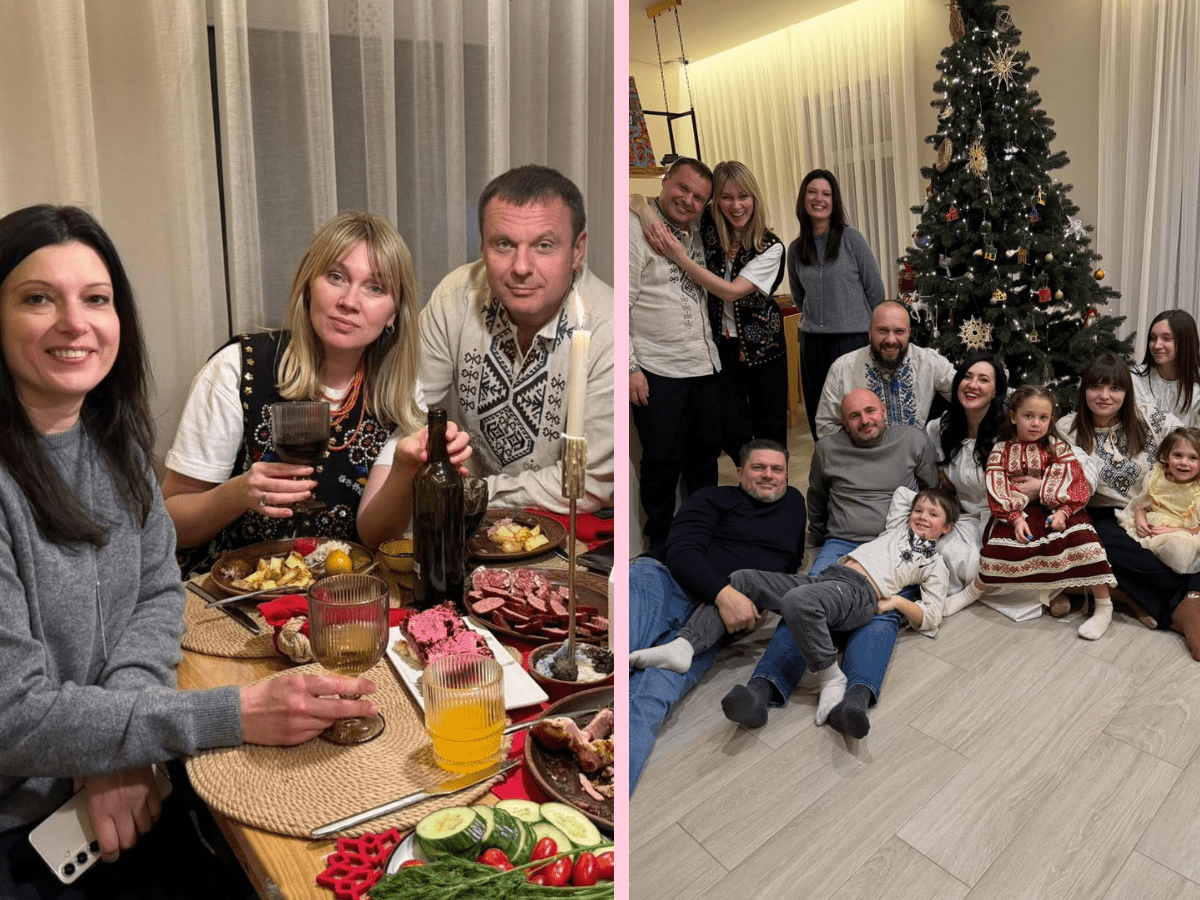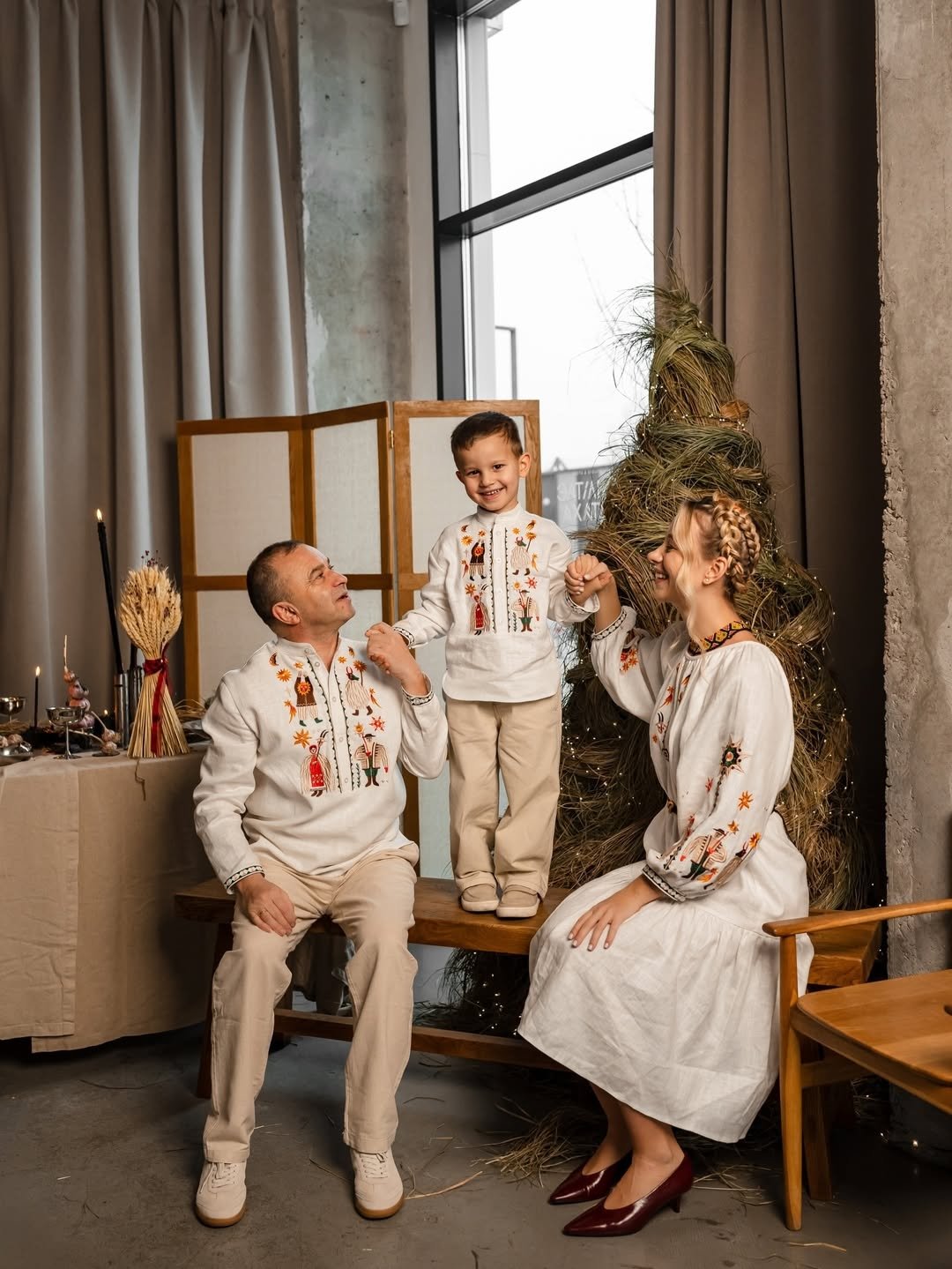 Семья выбрала традиционные украинские вышиванки, создав настоящую рождественскую атмосферу. Праздничный стол украшали зажженные свечи и небольшая елка. Среди угощений видны обязательные рождественские блюда, которых по традиции должно быть двенадцать: кутья, компот, голубцы и прочее.