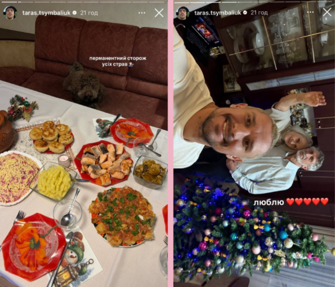 Известный холостяк Тарас Цымбалюк провел Рождество в кругу своей семьи. Хорошими моментами он поделился в соцсетях и показал, что приготовили его родители для особого праздника. Хоть и стол не был большим, как у большинства звезд, но на нем были обычные блюда: рыба, голубцы, разные салаты. Через кадры чувствуется особое тепло семьи.