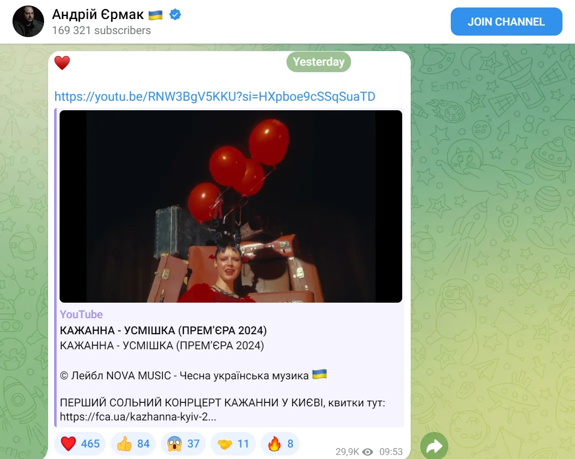 Отдельную волну обсуждений вызвала поддержка Андрея Ермака. Глава Офиса президента неоднократно распространял ее песни в своих соцсетях, что вызвало противоречивую реакцию в Сети. После этих репостов часть аудитории начала критиковать артистку, ведь в украинском обществе все еще настороженно относятся к любому пересечению художников с политикой.