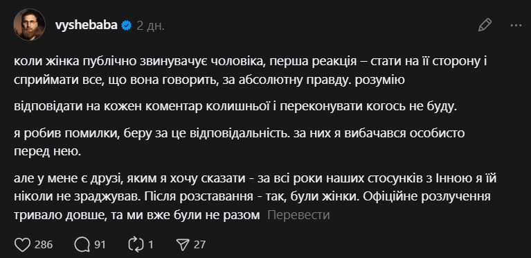 Тесленко отметила, что с уважением относится к службе Павла Вышебабы и его вклада как военного, но ей больно из-за человеческого отношения к ней и их общей дочери Зореславы. Она также попросила не представлять их развод как историю, якобы давно завершившуюся, ведь, по ее словам, это не соответствует реальности.