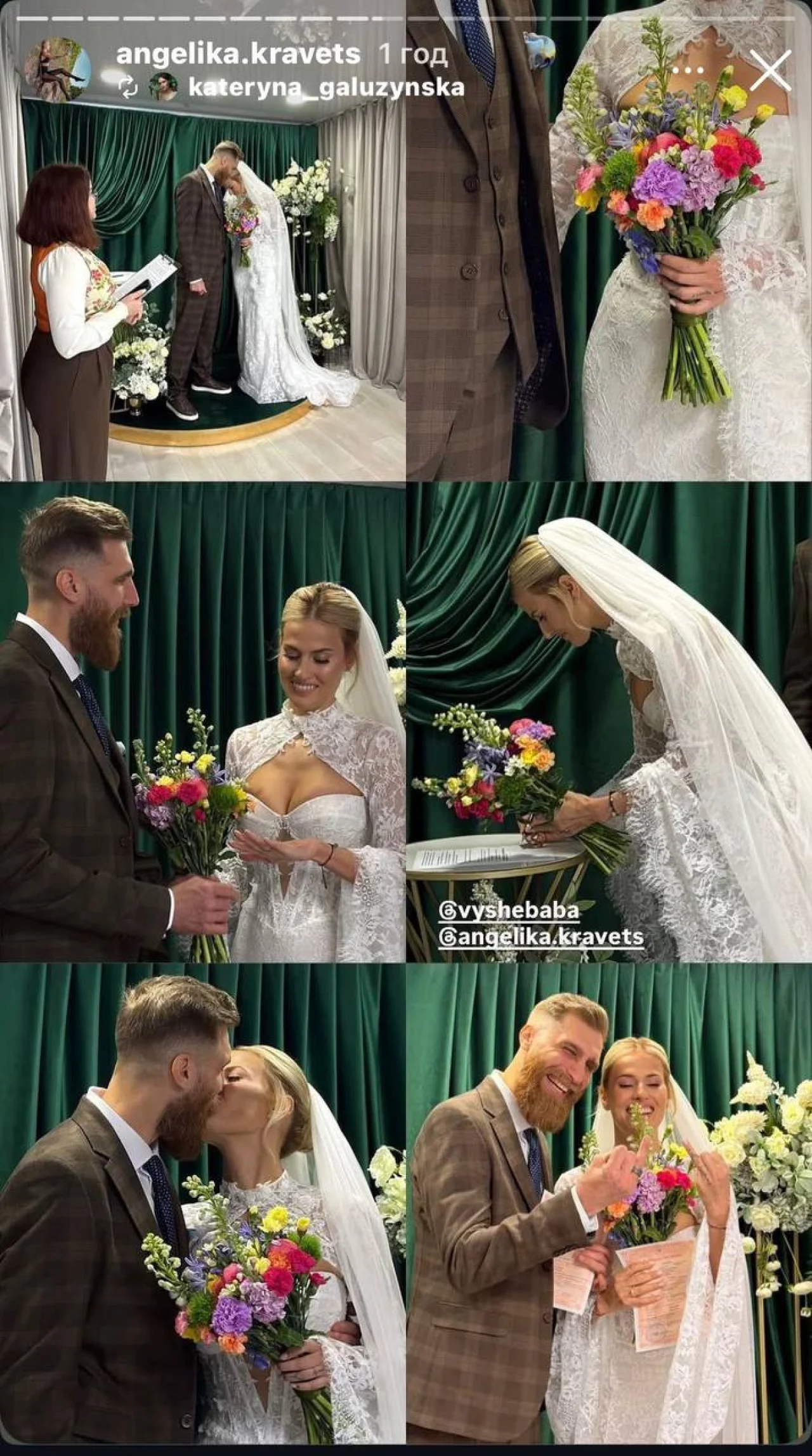 Невеста выбрала нежное платье с кружевом и корсетом и дополнила образ длинной фатой. Вышебаба же появился в классическом костюме-тройке в клетку, что придало образу сдержанной элегантности.