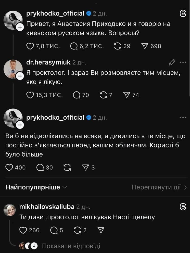 Все началось с сообщения Приходько в Threads, где она написала, что говорит "на киевском русском языке". Эта фраза моментально разлетелась по Сети и стала триггером для критики. В результате Центр Миколайчука заявил о четкой позиции, что поддержка украинской культуры, языка и ценностей является для них принципиальной.