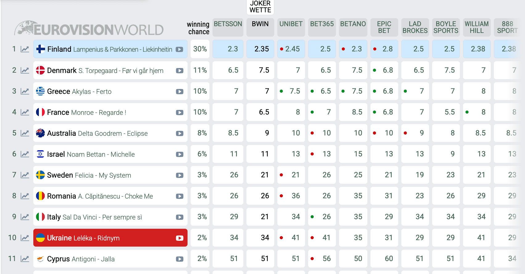 А что касается Украины, то еще совсем недавно мы занимали 8 позицию. Впрочем, сейчас ситуация изменилась. Представительницы от Украины — LELÉKA — прогнозируют уже 10 место! Теперь восьмую и девятую позиции занимают Румыния и Италия. Причем Румыния раньше вообще не входила в десятку фаворитов.