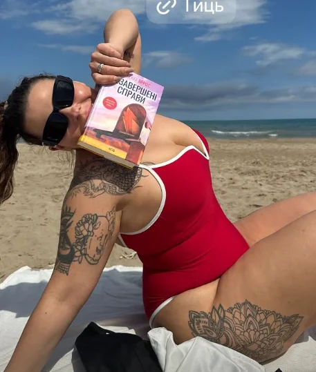 На этом кадре Александра запечатлена на пляже. Она сидела на белом покрывале в ярком красном сплошном купальнике с белой отделкой, который подчеркнул ее пышное декольте. На глазах у нее были очки от солнца, а в руке - книга. Свои волосы Зарицкая собрала в высокий хвост.