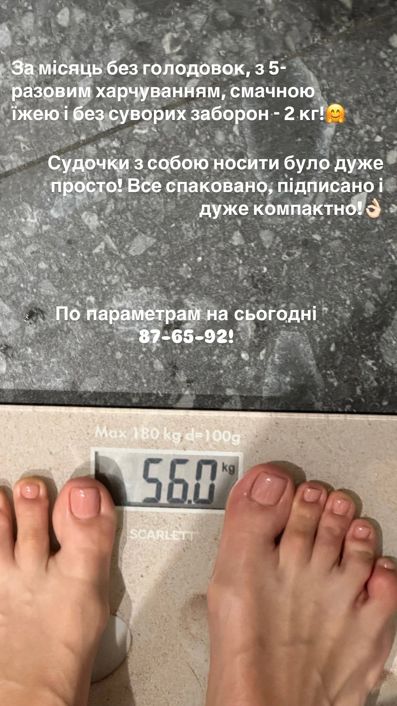 За месяц без голодовок, с пятиразовым питанием, вкусной едой и без строгих запретов - минус два килограмма. Судочки с собой носить было просто! Все упаковано, подписано и очень компактно,