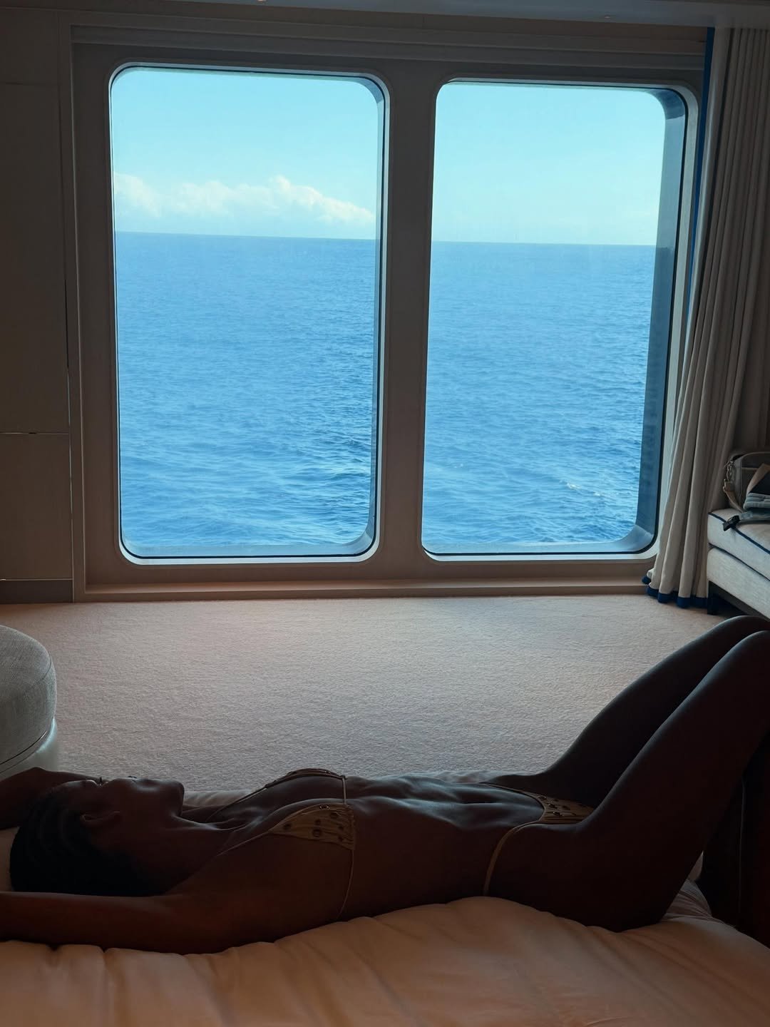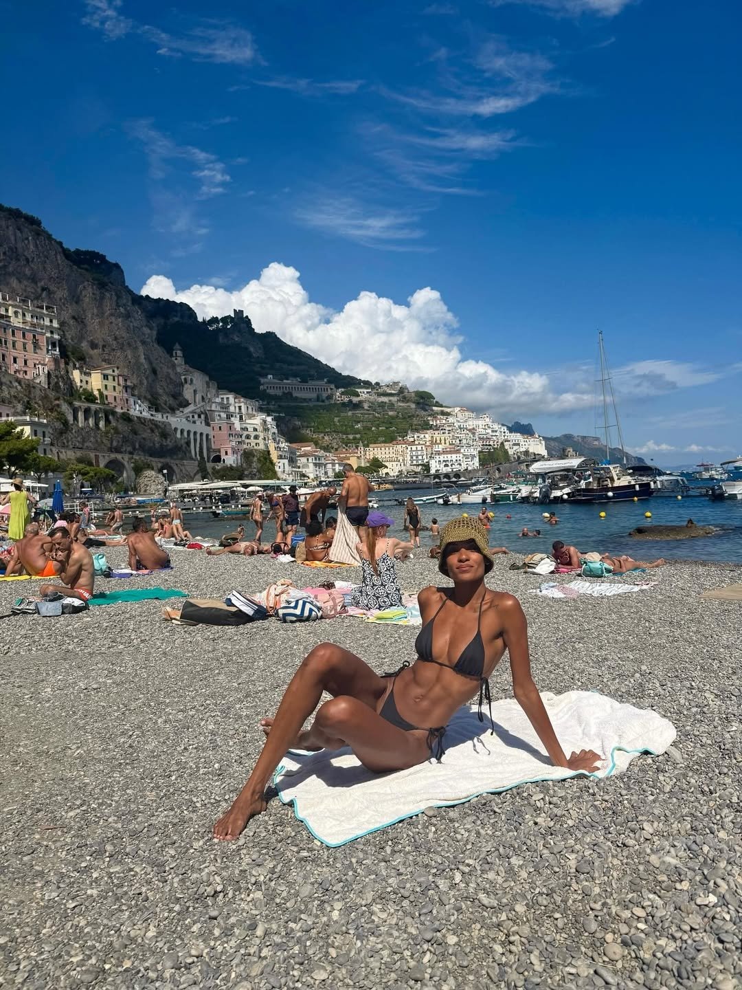 На них Нара запечатлена во время прогулки по побережью, отдыха на яхте и загара на пляже. Для последнего она выбрала модные бикини в классическом черном цвете и трендовом цвете сливочного масла с серебристыми люверсами. Оба купальника идеально подходили к подтянутой фигуре Баптисты!