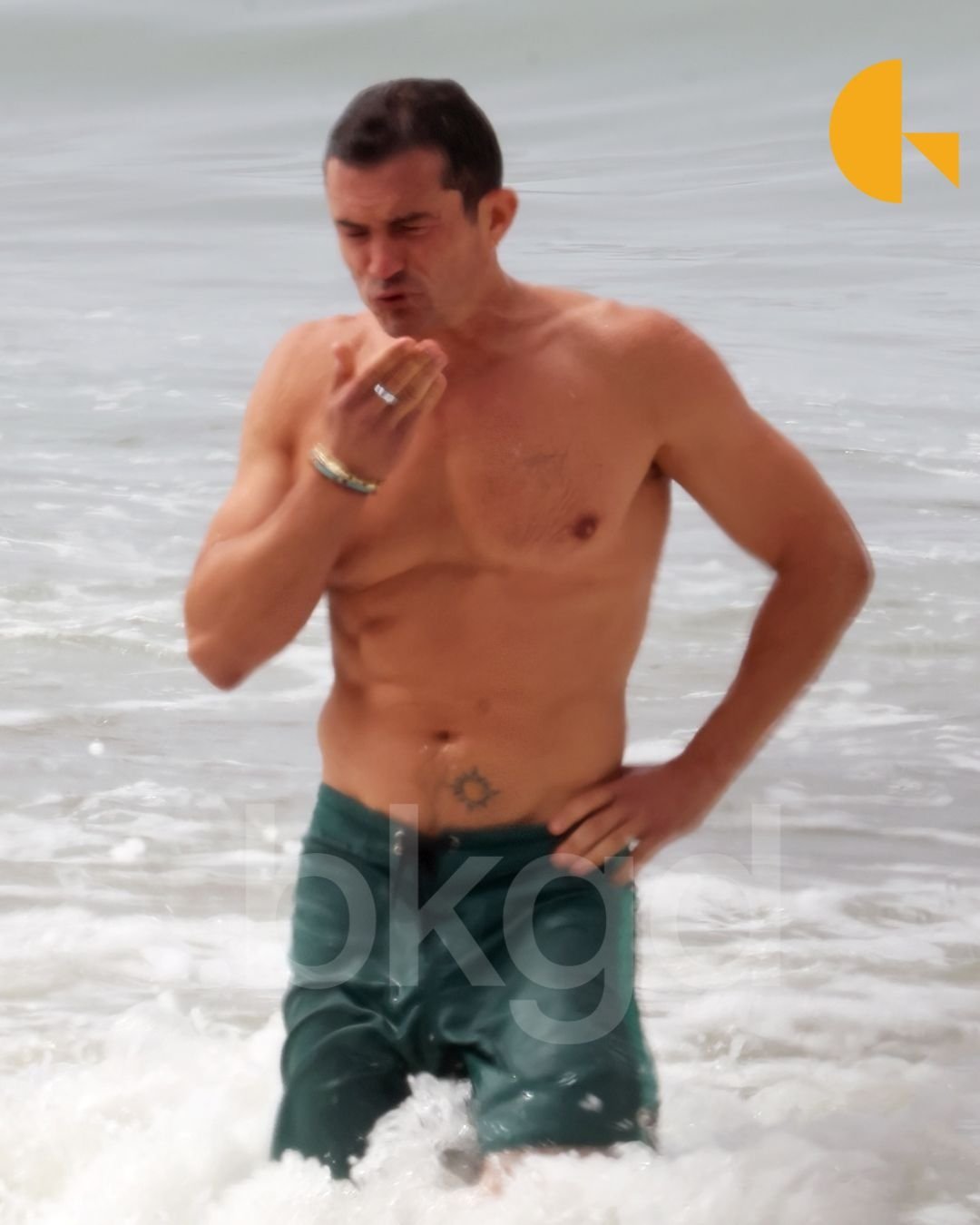 В этот день на Орландо были темно-зеленые шорты до колен и несколько браслетов. Мужчина находится в отличной форме - вы только посмотрите на его рельефные мышцы пресса!