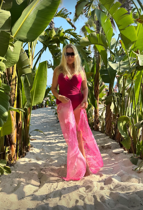 Имея стройные формы, Ольга смело демонстрирует фигуру в купальниках. На отдых она взяла с собой две модели - раздельный черный с принтом в виде желтых листьев и цельный малиновый. Последний она дополнила розовым парео. Согласитесь, Сумская выглядит роскошно!