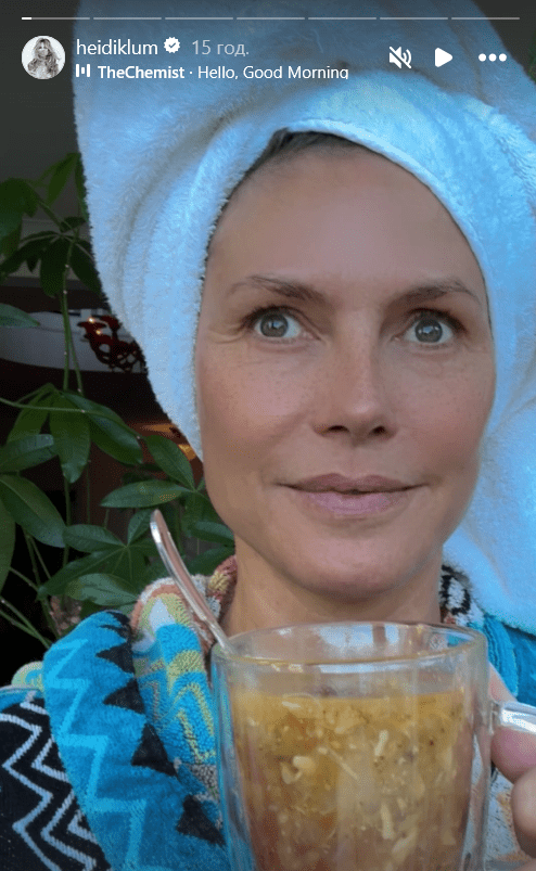 Хайди была одета в разноцветный халат, а на голове у нее был завязан белый полотенце. В руке она держала стеклянную прозрачную чашку. В свои годы даже утром и без косметики знаменитость выглядит великолепно. Настоящая красотка!