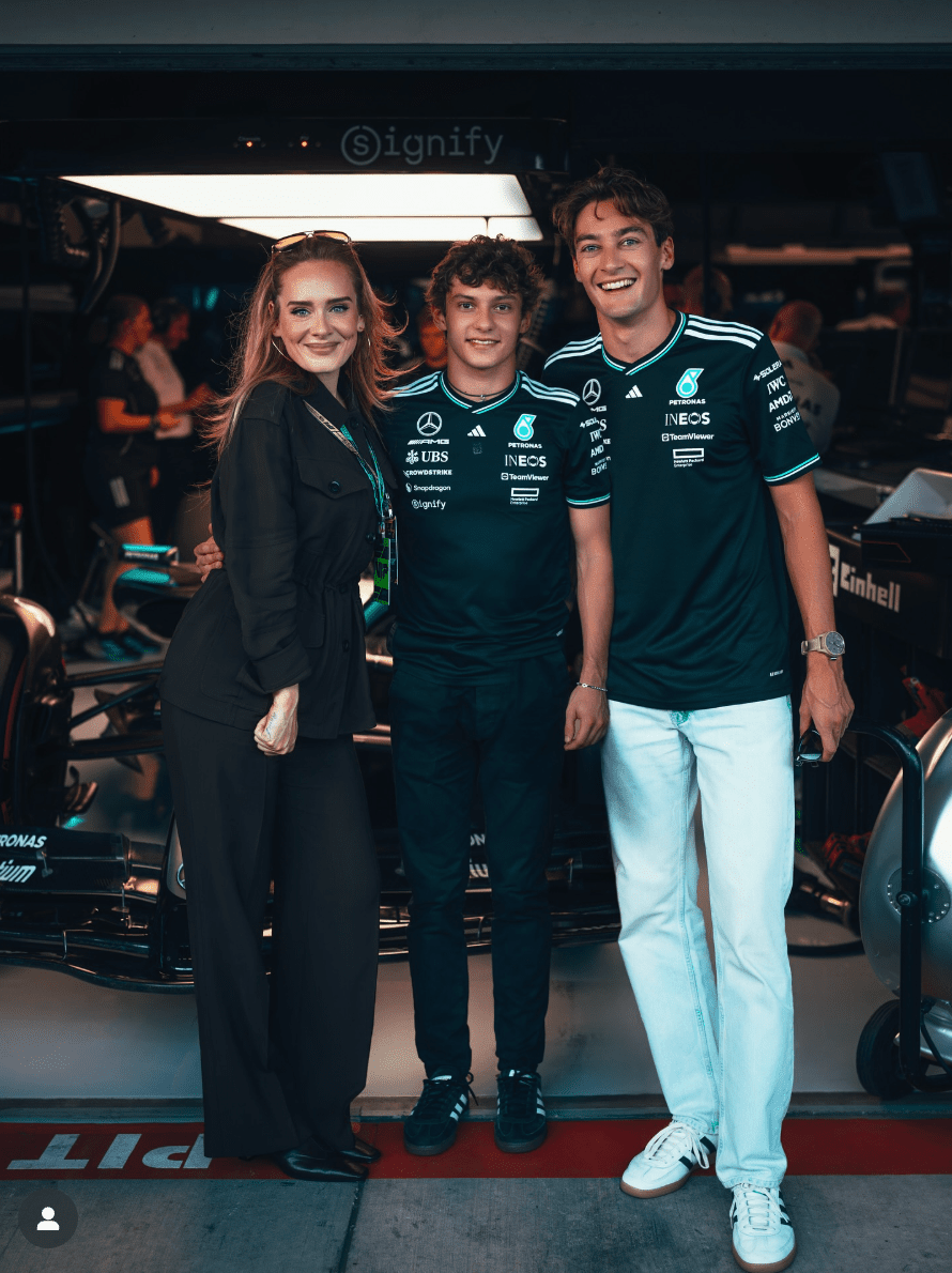 В компании пилотов Джорджа Рассела и Кими Антонелли Адель выглядела очень радостно. Певица позировала в черном костюме, прекрасно подчеркивавшем ее стройную фигуру.