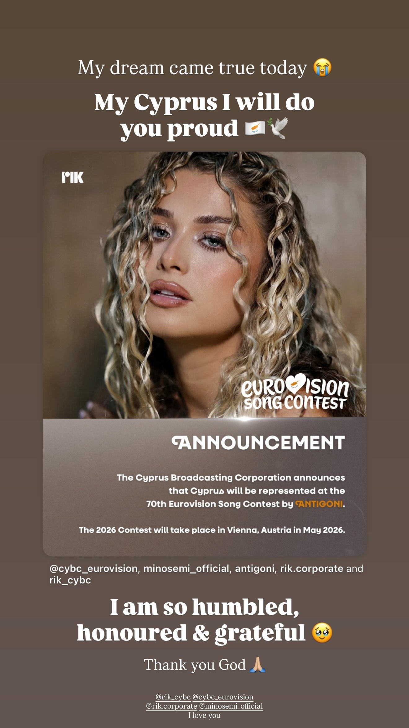 Моя мечта сбылась сегодня. Кипр, я заставлю тебя гордиться мной. Я очень тронута, горда и благодарна.