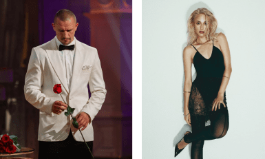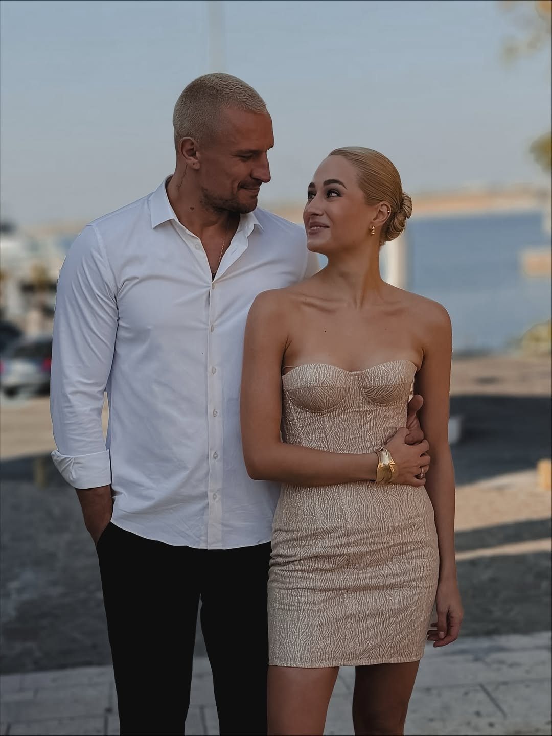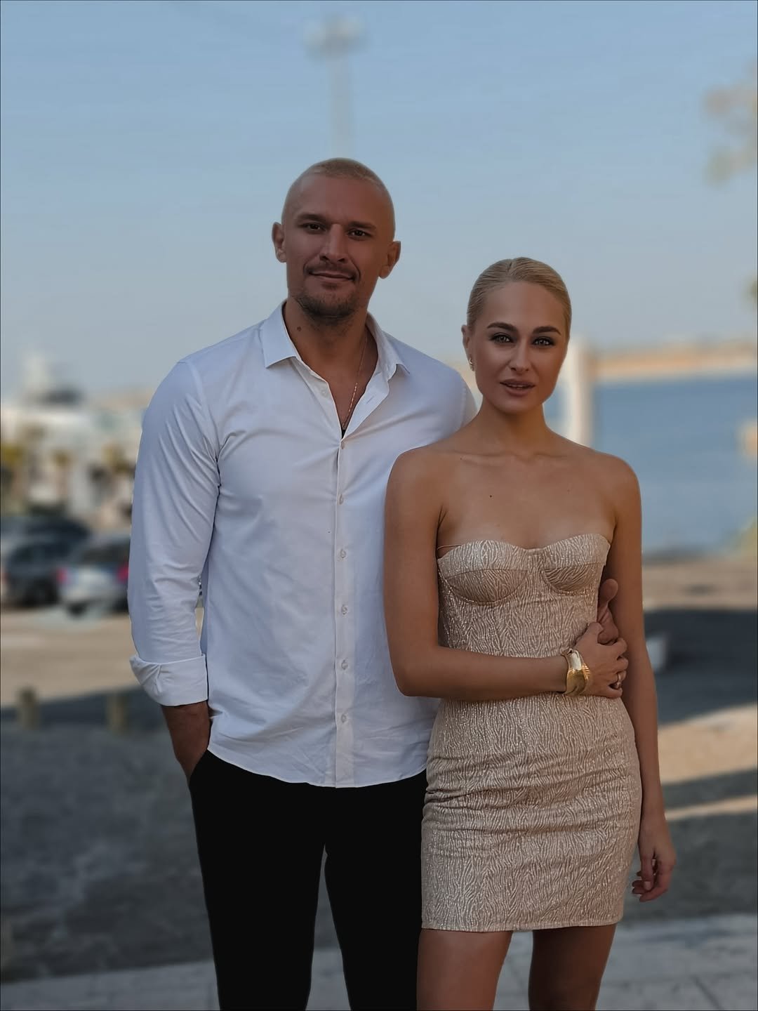 На кадрах актриса позирует в коротком молочном платье без бретелек в объятиях коллеги. А Цымбалюк появился в классическом образе с белой рубашкой и черными брюками.