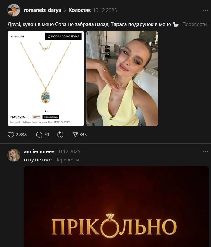 Романец отметила, что кулон от украинского ювелирного бренда SOVA никто у нее не забирал. По словам участницы, украшение до сих пор находится у нее, несмотря на завершение съемок реалити.