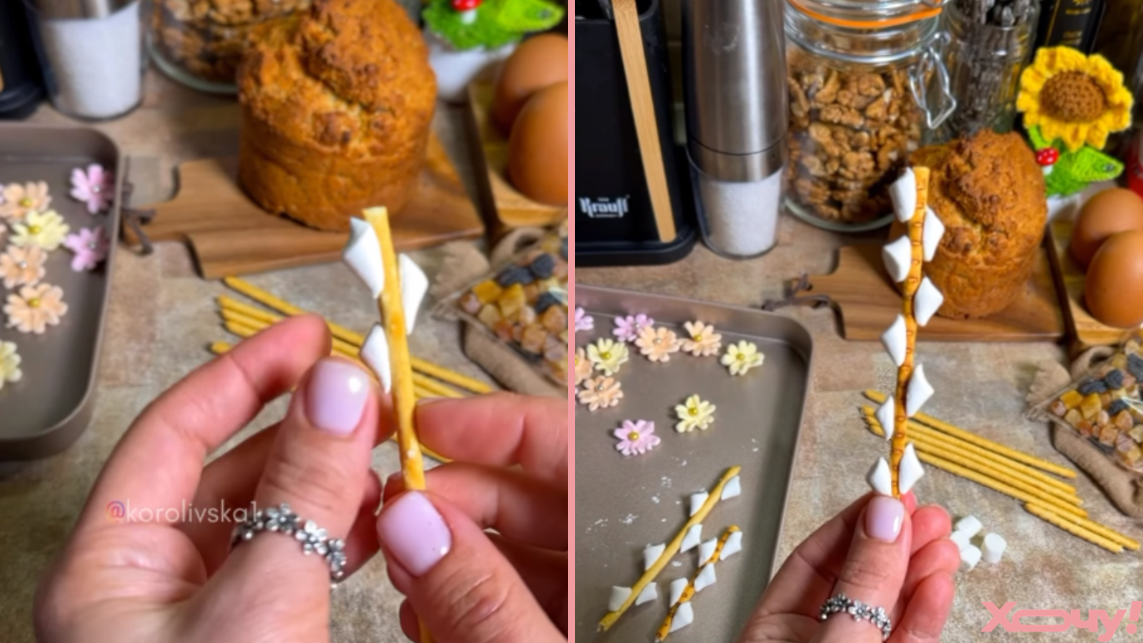 В блоге korolivska1 поделились сразу двумя идеями самодельных съедобных украшений на паски. Это буквы “ХВ” из шоколада и нежные ивовые веточки из соломки и маршмелоу.