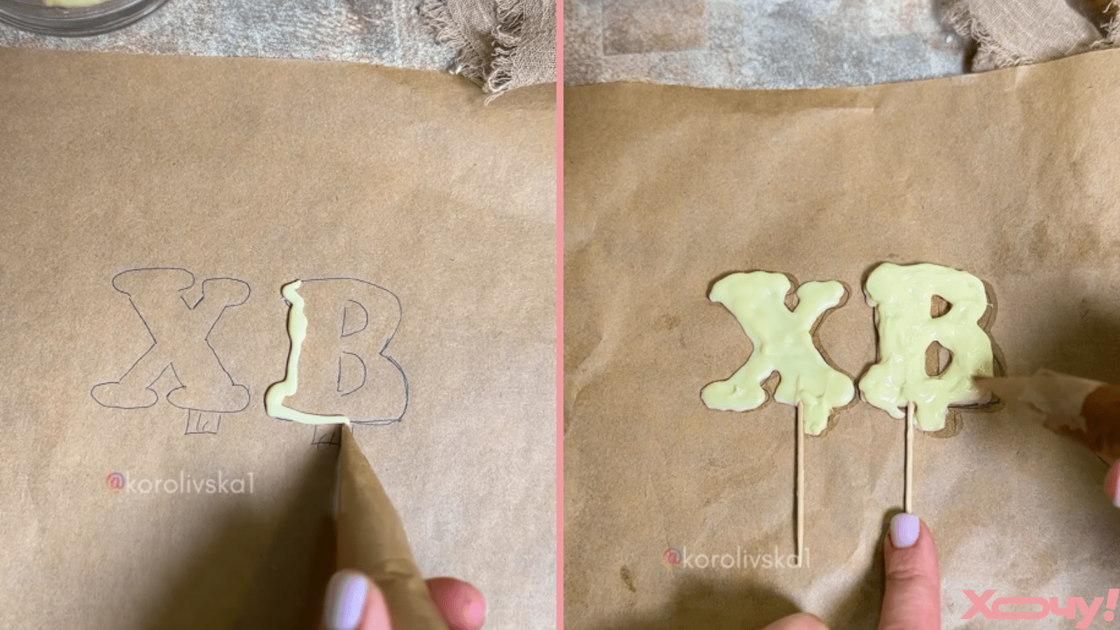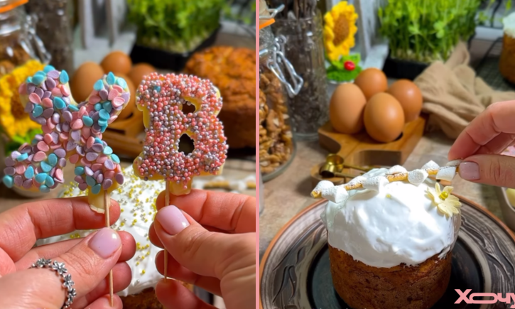 “ХВ”, то есть “Христос Воскрес” — традиционный элемент пасхального декора. Чтобы сделать такие буквы самостоятельно, понадобится пергамент, зубочистки, кондитерский мешок, карандаш, шоколад и цветная посыпка.