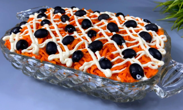 Наверх выкладываем корейскую морковь. Делаем ровную и красивую сеточку из майонеза, украшаем маслинами.