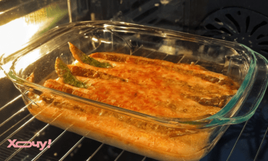 Готовый соус выкладываем на дно формы для выпечки. В соус кладем спаржу и посыпаем сыром. Запекаем при 200°C 10–15 минут или просто до румяной корочки.