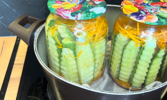 Прикрываем крышкой. В кастрюле с водой стерилизуем банки 10 минут с момента закипания. Вынимаем и герметично закручиваем.