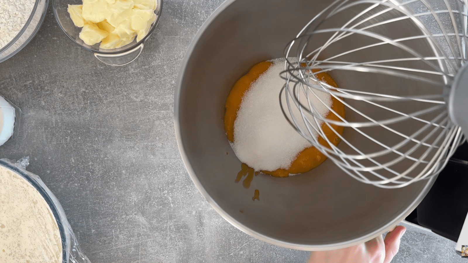 Для опары соединяем теплое молоко, сахар, дрожжи и немного муки. Накрываем плёнкой и оставляем в тепле на 30-40 минут. Когда настоится опара, желтки, сахар и ванильный сахар взбиваем, пока масса не посветлеет и сахар не растворится. Добавляем мягкое сливочное масло.