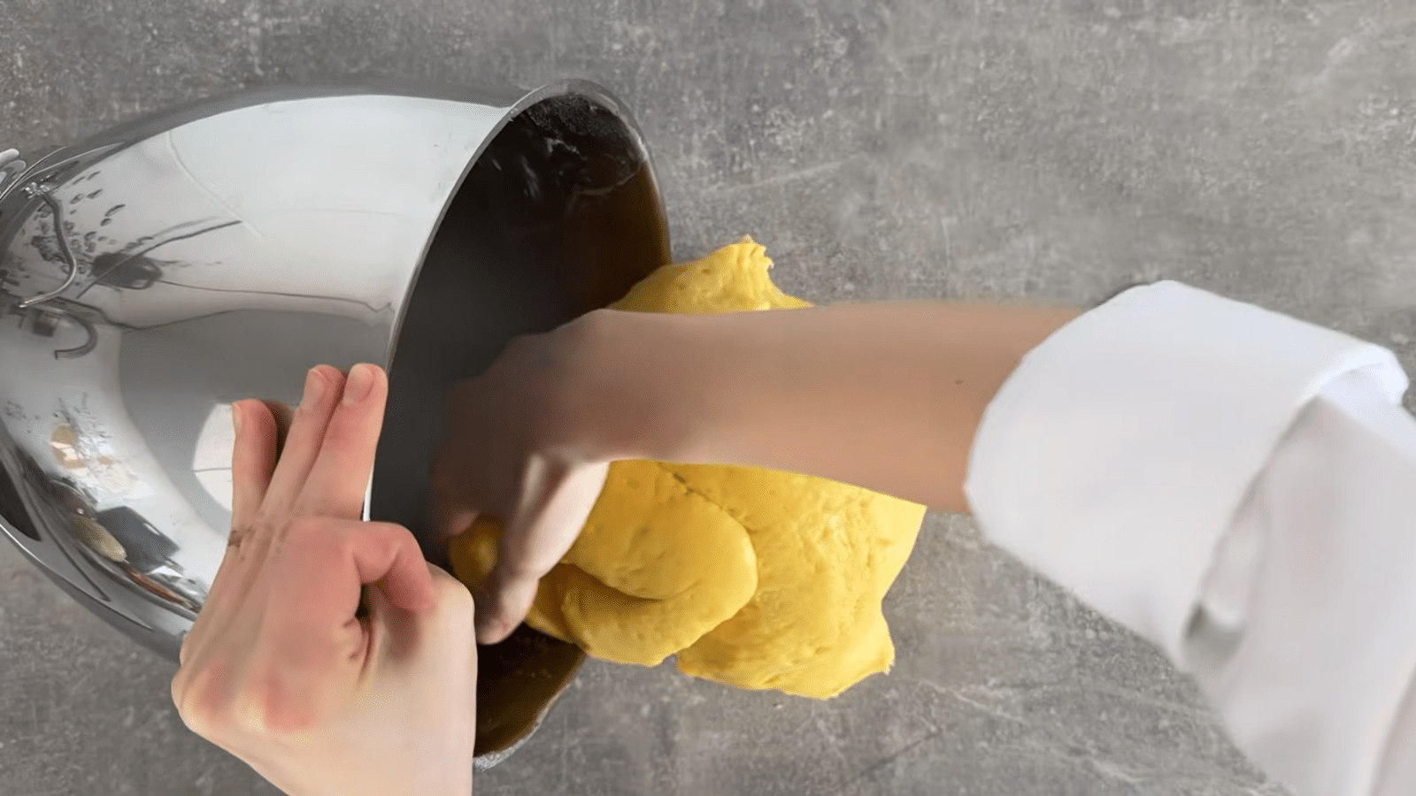 После того как все ингредиенты объединятся, замешиваем еще минут 5-7. Переводим его в глубокую миску и накрываем пленкой. Оставляем на час.