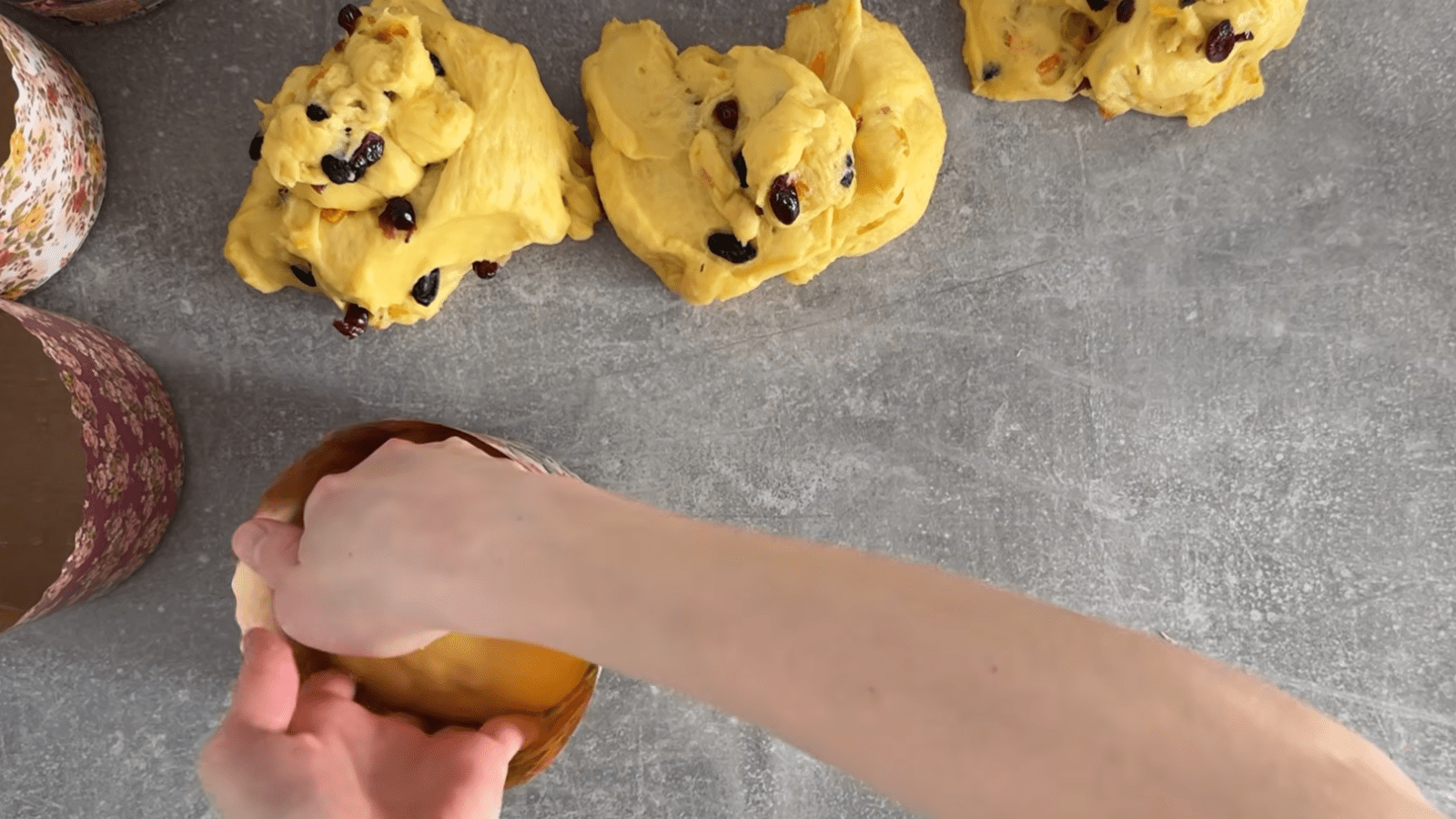 Оставляем в тепле еще на 30 минут. Формируем паски и выкладываем где-то на треть высоты формы. Оставляем под пленкой еще на 40-50 минут. Выпекаем их в духовке, разогретой до 170°, 30-35 минут.