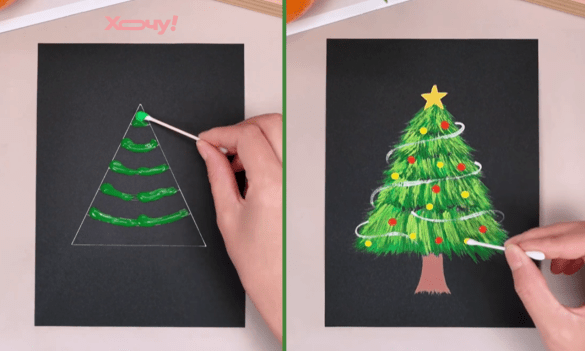 Шаг 5. Белой краской, с помощью кисточки, дорисуйте на елку гирлянду. А ушными палочками — цветные шарики.