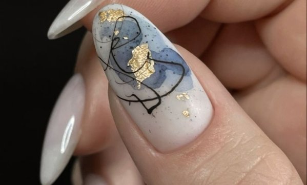 Не менш стильно виглядає павутинка на фоні акварельний плям. За допомогою акварельних крапель для нігтів, або професійної фарби, зобразіть на однотонному фоні гарні розводи чи ефект мармуру. Зафіксуйте все матовим фінішем. Довершіть дизайн павутинкою.