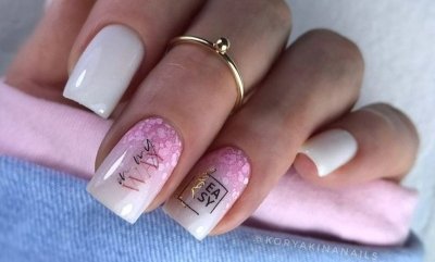 Покритий базою ніготь декоруйте блискітками біля кутикули, трішки розтушувавши їх донизу. Наймодніший варіант — крупні багатогранники. Вони можуть не блискотіти, а бути просто у кольорі. Просушіть ніготь в лампі. Тепер візьміть молочний гель-лак, і покрийте ним ніготь, не чіпаючи блискітки. Трішки молочного відтінку розтягніть ближче кутикули, аби зробити ефект криги , що починає покривати декор. Просушіть ніготь. Перекрийте глянцевим фінішем.