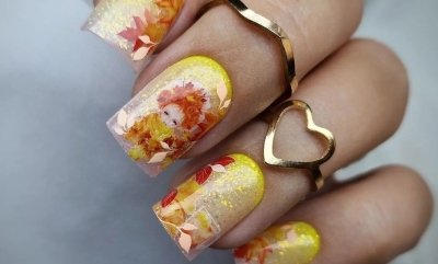Золота втирка знову в моді. Вона може бути поєднана із декором на інших нігтях. А ще можна зробити одну руку із золотими нігтиками, а другу — в декорі. Замість втирки можна використати фольгу осінніх відтінків, або ж оздобити нігті пателлю на всю довжину.