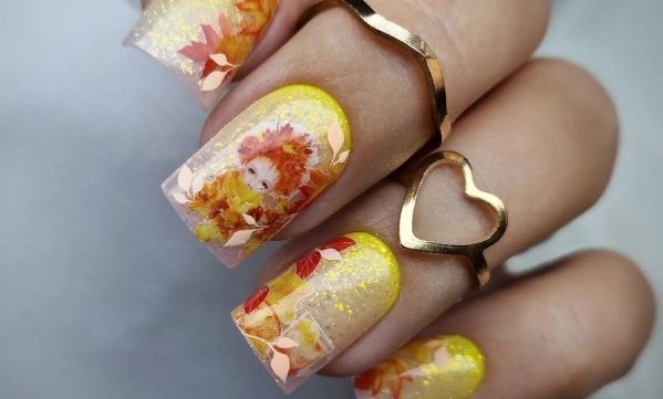 Залишаються актуальними нігті зі стразами, осінніми малюнками листя, грибів та гілок. Шарму додадуть надписи і сюжетні міні-картинки. Сучасні наклейки і слайдери стануть у пригоді, якщо ви хочете зекономити час на малюванні.